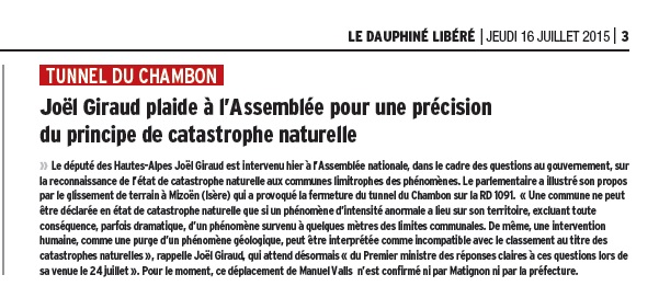 Joël Giraud est intervenu ce jour à l’Assemblée Nationale, dans le cadre des questions au gouvernement, sur la reconnaissance de l'état de catastrophe naturelle aux communes limitrophes des phénomènes et a illustré son propos par l'exemple du glissement de terrain qui a provoqué la fermeture du tunnel du Chambon.