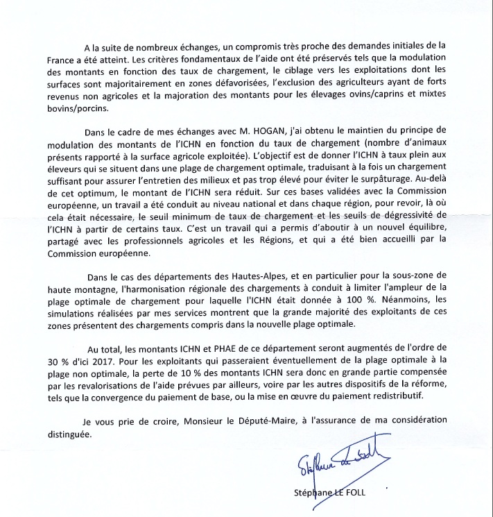Le député constate dans son courrier, comme beaucoup, le désarroi et « le désespoir » des éleveurs dans le département et rappelle à la Ministre de l’Écologie à son bon souvenir sa visite, il y a un an, à la rencontre des éleveurs dans le Parc Nationale des Écrins, et demande des mesures appropriés.