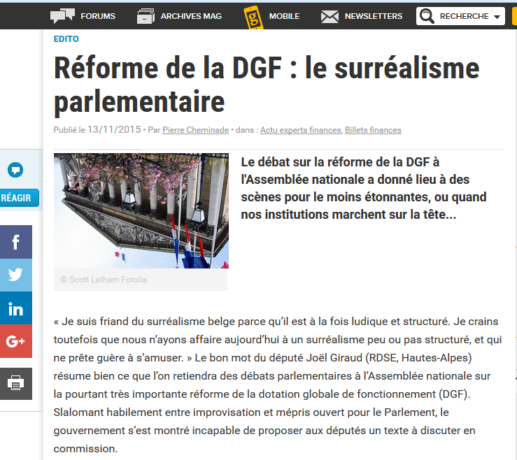 Il a ensuite rappelé les exigences de son groupe dans le cadre de la réforme de la Dotation Globale de Fonctionnement (DGF) :